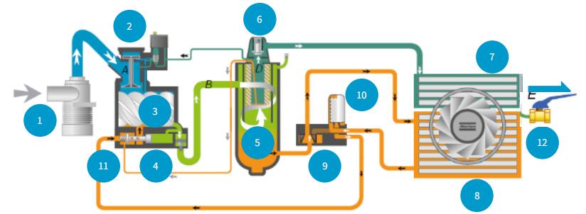 1、空氣過濾器;2、進氣閥;3、螺桿轉子;4、止回閥;5、油分芯;6、最小壓力閥;7、冷卻器;8、油冷卻器;9、溫度調節旁通閥;10、油過濾器;11、斷油閥;12、手動排污閥。
