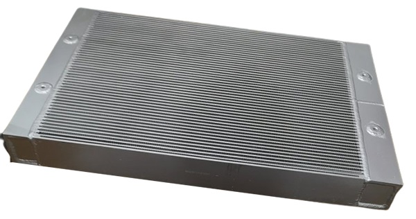 風冷的板翅式冷卻器為鋁或鋁合金材質(zhì)釬焊制成,高溫的油和壓縮空氣在冷卻器內(nèi)流動,通過散熱風扇強制對流將熱量帶走。