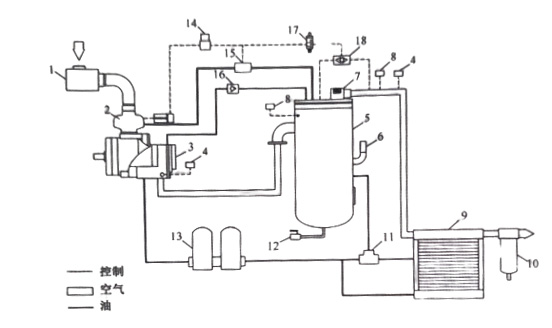 上圖為風冷型螺桿空壓機工作流程圖,1、空氣過濾器;2、進氣閥;3、主機;4、溫度傳感器;5、油氣桶;6、安全閥;7、最小壓力閥;8、壓力傳感器;9、冷卻器;10、氣水分離器;11、溫控閥;12、排污閥;13、油過濾器;14、容調閥;15、放空閥;16、單向閥;17、電磁閥;18、梭閥