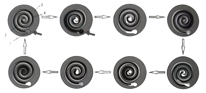 下圖最外圈的基元容積1隨主軸的轉動而逐漸張開,氣體從進氣口進入空壓機腔內,進入的氣體量隨轉角的增大而增大,進而達到最大值。隨著主軸的繼續轉動和開口的逐漸關閉,基元容積1的容積又有所減少,吐出少量氣體,最后形成封閉容積。同時,在關閉基元容積1的過程中,相對基元容積2來說,是一個容積逐漸增大的過程,氣體從進氣口被吸入基元容積2。