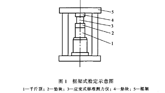 框架式檢定。千斤頂安裝調整成工作狀態,將千斤頂安放在檢定框架底座中間,與應變式標準測力儀串接。使千斤頂、應變式標準測力儀與檢定框架對中,且符合加力條件的要求。千斤頂與應變式標準測力儀之間,可根據需要放置墊塊,調整空間高度,使千斤頂活塞伸出量接近工作狀態,如圖1