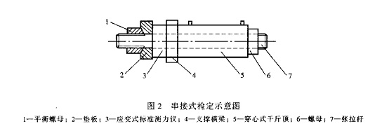 串接式檢定。千斤頂與應變式標準測力儀串接在張拉桿上,調整三者在同一軸線后進行檢定,如圖2。